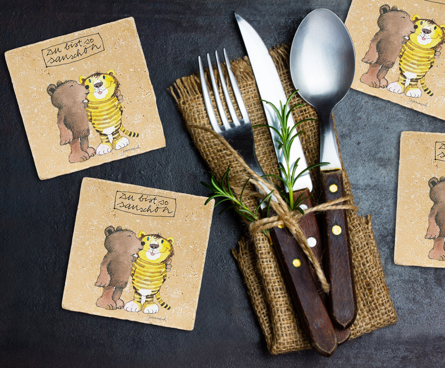 Unsere hochwertigen Naturstein-Untersetzer im 4er-Set sind nicht nur praktisch, sondern auch echte Design-Highlights! Ab sofort sind sie auch in einzigartigen Tigerenten-Motiven von Janosch erhältlich – charmant, verspielt und unverwechselbar.